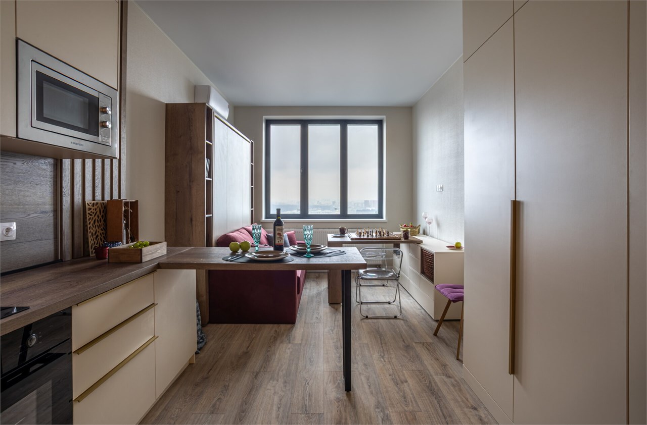 Закончили еще один интересный объект. Полностью меблировали квартиру-студию площадью 29,9 кв.м. Превратили длинное узкое пространство с одним окном в светлый, уютный и функциональный дом.